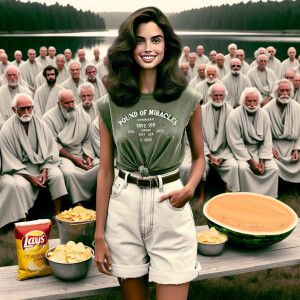 «Photorealistic image. Strawberry blonde woman from USA cheering...»
