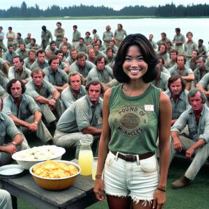 «create a film snapshot from 1972 of dozens of dour men standing...»