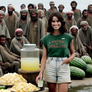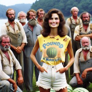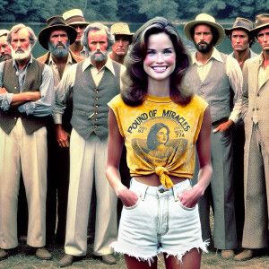 «create a film snapshot from 1972 of dozens of dour men standing...»