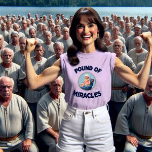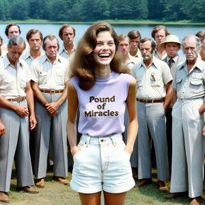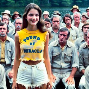 «create a film snapshot of dozens of dour men standing by a lake...»