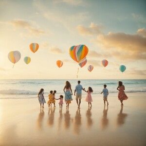 «Five couples with children playing on the beach, joyfully celebr...»