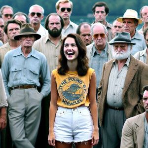 «create a film snapshot from 1972 of dozens of dour men standing...»