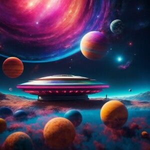 «A spaceship gracefully soaring past distant planets in uncharted...»