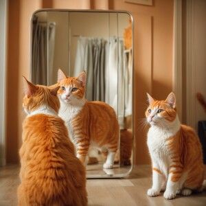 «An excessively large and plump, orange and white cat with big ex...»