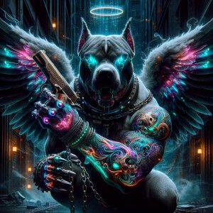 «A dystopian dark art image of a menacing winged pitbull with lig...»