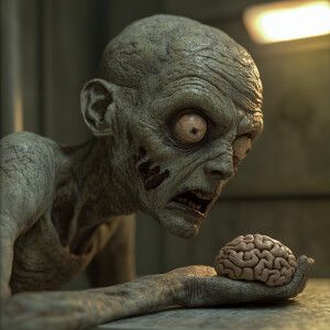 «A zombie looking for his brain, egxrated confused look on zombi...»
