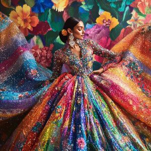 «The image showcases a person dressed in a vibrant traditional ou...»