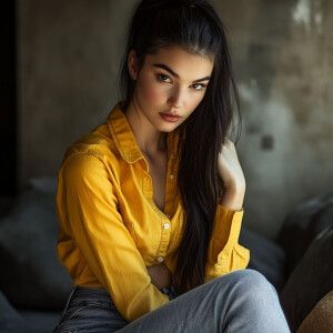 «Capture the elegance of a fair-skinned woman with dark long hair...»