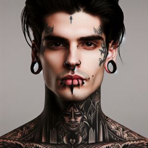 «A black haired Gothic Man with piercings and Gothic tattoos»