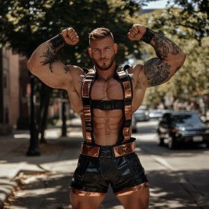 «In this image, a muscular man is posing on an outdoor street, fl...»