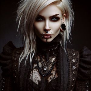 «A Blonde haired Gothic Woman with piercings and Gothic tattoos»