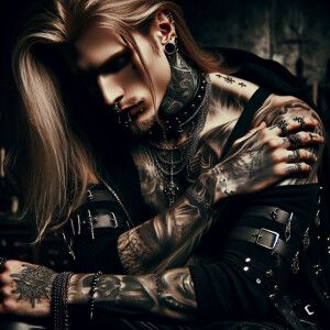 «A long blonde haired Gothic Man with piercings and Gothic tattoo...»