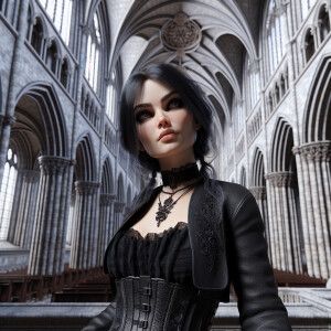«Gothic Woman with black hair standing In a Gothic cathedral»