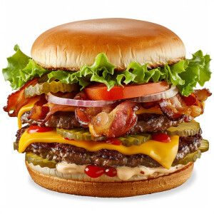 «Generate an image of a double cheeseburger featuring crispy baco...»