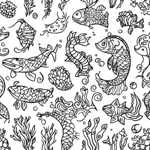 «coloring book page::A whimsical pattern of mermaids and sea crea...»