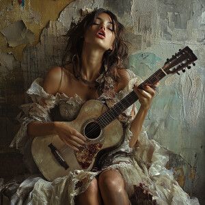 «A woman in a tattered dress, playing guitar with intricate hand...»