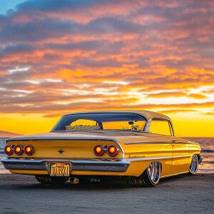 «a heavily modified, lowrider yellow 1961 Impala with custom whee...»