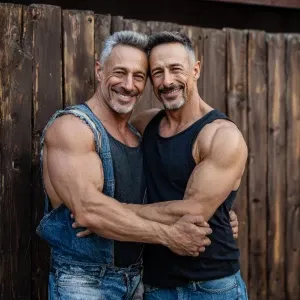 «Two bodybuilder men sharing a warm and affectionate embrace, con...»