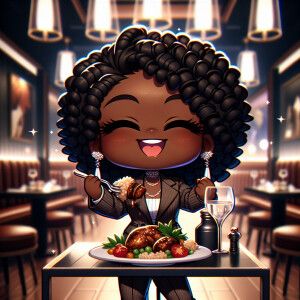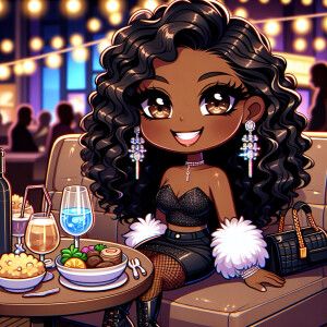 «A sophisticated, Chibi-style melanin woman with glossy curls, en...»