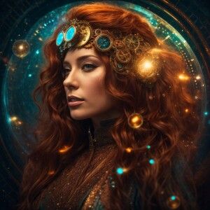 «Steampunk Virgo. Facing front, long red hair, pale skin, brown e...»