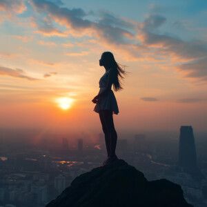 «Fair-skinned woman with dark long hair, elegant and composed, st...»