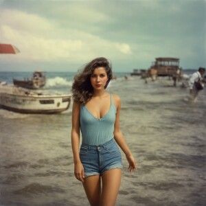 «Create a realistic color snapshot from 1972 of a beautiful, brun...»