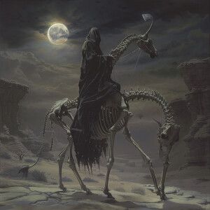 «The grim reaper, cloaked in tattered black robes, rides atop a t...»