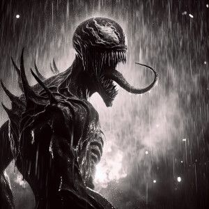 «horrorcore effect image of venom standing in a firey heavy rain...»