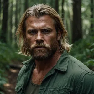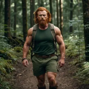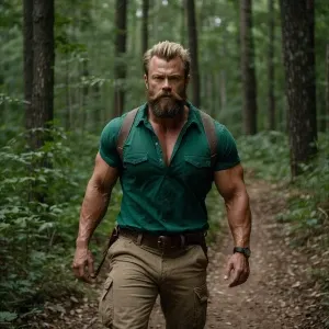 «Generate an image of a rugged, muscular man with a shirtless hai...»