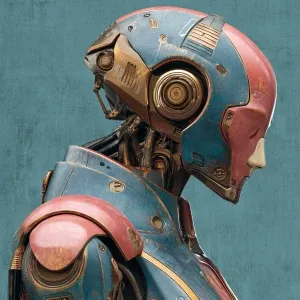 «Retro-futuristic robot DJ with wires and circuits exposed, vibra...»