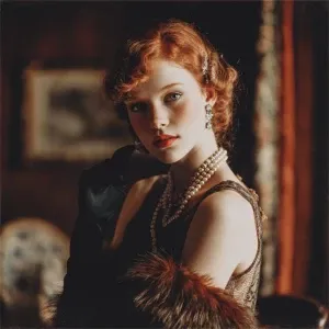 «A redhead supermodel dressed in 1920s clothes high end luxury si...»