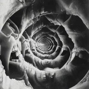 «In a shadowy attic, a hauntingly elegant specter of a woman gaze...»
