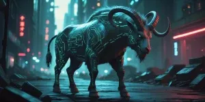 «An imposing werewolf with sleek, metallic fur and glowing neon e...»