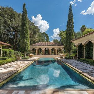«A large mansion with a pool»
