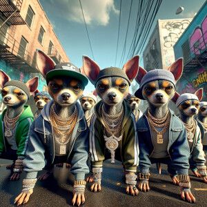 «A pack humanoid chihuahuas dressed in hip-hop clothing and jewel...»
