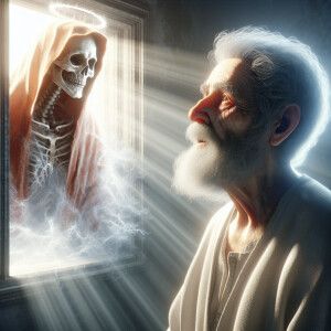 «Old man encountering benevolent Death. Realistic, atmospheric