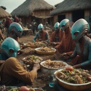 «A group of extraterrestrial beings feasting on carcasses in thei...»