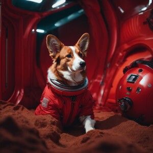 «A red Brendle welsh cardigan corgi in a space suit in 2070 in a...»