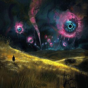 «secret archive photo, a surreal night landscape with a yellow gr...»