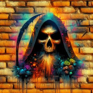 «a maximalist photo inspired by grafitti brick wall grim reaper...»