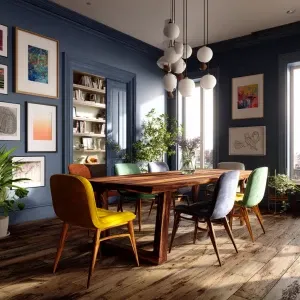 «Create an image of a Nordic dining room featuring deep blue wall...»
