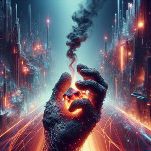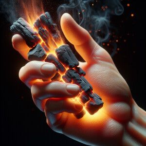 «A hand holding onto hot cole, you can see the smoke and hand cha...»