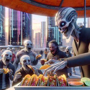 «A goulish street vendor selling tacos, aliens eating tacos aro...»