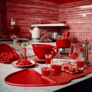 «A KITCHEN SETTING WITH A BREAKFAST THEME. THERE IS A PAIR OF RED...»
