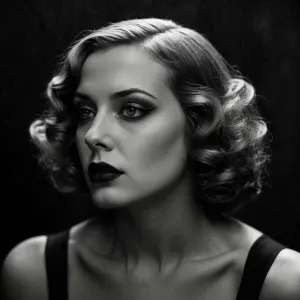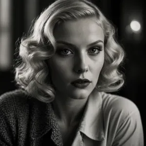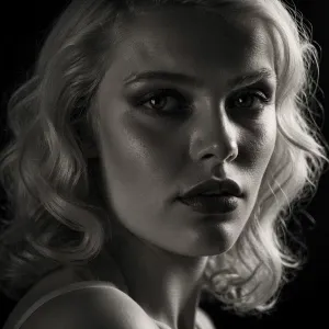«Create a high-detail, black-and-white portrait of a blonde woman...»