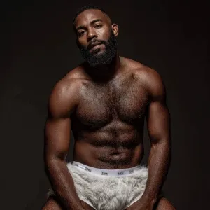 «A close-up portrait of a muscular white man with a beard, sittin...»