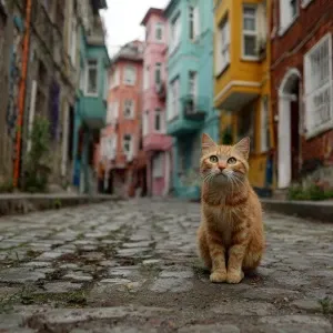 «Bir cadde üzerinde tek başına duran sevimli bir kedi. Sokak lamb...»