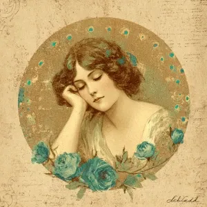 «Aged music sheets overlapped with lace/doily corners; pale teal...»
