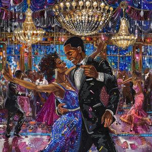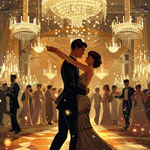 «Illustrate an Afrocentric couple in glamorous flapper attire, da...»