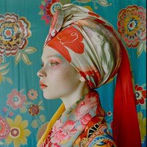 «Fair-skinned woman with dark long hair, elegant and composed, ca...»